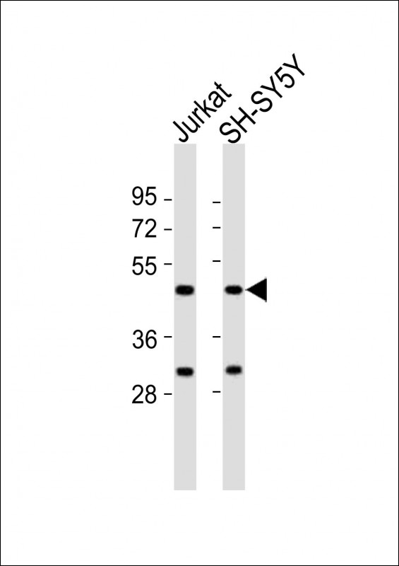 All lanes : Anti-ZIC1 Antibody (N-term) at 1:2000 dilution Lane 1: Jurkat whole cell lysates Lane 2: SH-SY5Y whole cell lysates Lysates/proteins at 20 μg per lane. Secondary Goat Anti-Rabbit IgG, (H+L), Peroxidase conjugated at 1/10000 dilution Predicted band size : 48 kDa Blocking/Dilution buffer: 5% NFDM/TBST.