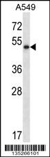 PNLIP Antibody (C-term) (Cat. AMR09404G) western blot analysis in A549 cell line lysates (35ug/lane).This demonstrates the PNLIP antibody detected the PNLIP protein (arrow). |