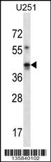 GIPC1 Antibody (N-term) (Cat. APR16140G) western blot analysis in U251 cell line lysates (35ug/lane).This demonstrates the GIPC1 antibody detected the GIPC1 protein (arrow).