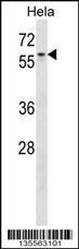 AGFG1 Antibody (N-term) (Cat. APR14875G) western blot analysis in Hela cell line lysates (35ug/lane).This demonstrates the AGFG1 antibody detected the AGFG1 protein (arrow). |