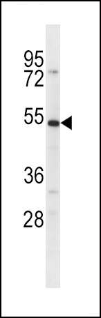 SLC39A14 Antibody (N-term) (Cat. APR10087G) western blot analysis in U251 cell line lysates (35ug/lane).This demonstrates the SLC39A14 antibody detected the SLC39A14 protein (arrow). |