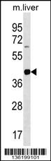 Mouse Lims2 Antibody (C-term) (Cat. APR17425G) western blot analysis in mouse liver tissue lysates (35ug/lane).This demonstrates the Lims2 antibody detected the Lims2 protein (arrow). |