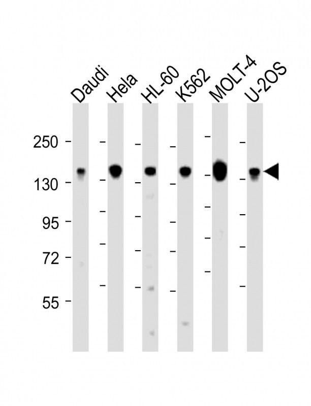 All lanes : Anti-THRAP3 Antibody (C-term) at 1:2000 dilution Lane 1: Daudi whole cell lysate Lane 2: Hela whole cell lysate Lane 3: HL-60 whole cell lysate Lane 4: K562 whole cell lysate Lane 5: MOLT-4 whole cell lysate Lane 6: U-2OS whole cell lysate Lysates/proteins at 20 μg per lane. Secondary Goat Anti-Rabbit IgG, (H+L), Peroxidase conjugated at 1/10000 dilution. Predicted band size : 109 kDa Blocking/Dilution buffer: 5% NFDM/TBST.