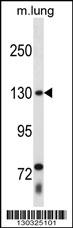 THRAP3 Antibody (C-term) (Cat. AMM08200G) western blot analysis in mouse lung tissue lysates (35ug/lane).This demonstrates the THRAP3 antibody detected the THRAP3 protein (arrow). |