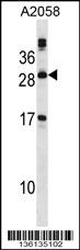 PLA2G12A Antibody (Center) (Cat. AMR09315G) western blot analysis in A2058 cell line lysates (35ug/lane).This demonstrates the PLA2G12A antibody detected the PLA2G12A protein (arrow).