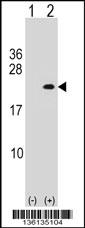 Western blot analysis of PLA2G12A (arrow) using rabbit polyclonal PLA2G12A Antibody (Center) (Cat. AMR09315G). 293 cell lysates (2 ug/lane) either nontransfected (Lane 1) or transiently transfected (Lane 2) with the PLA2G12A gene. |