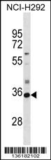SULT2A1 Antibody (N-term) (Cat. APR10335G) western blot analysis in NCI-H292 cell line lysates (35ug/lane).This demonstrates the SULT2A1 antibody detected the SULT2A1 protein (arrow). |