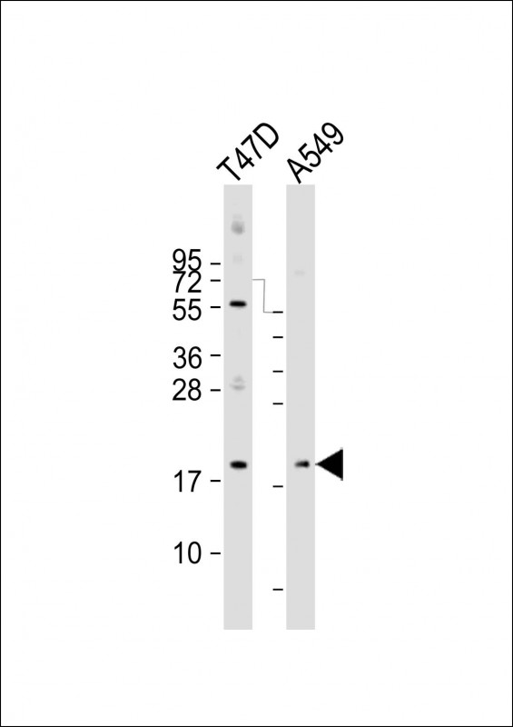 All lanes : Anti-ARL2 Antibody (Center) at 1:2000 dilution Lane 1: T47D whole cell lysate Lane 2: A549 whole cell lysate Lysates/proteins at 20 μg per lane. Secondary Goat Anti-Rabbit IgG, (H+L), Peroxidase conjugated at 1/10000 dilution. Predicted band size : 21 kDa Blocking/Dilution buffer: 5% NFDM/TBST.