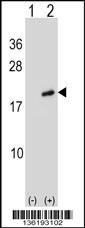 Western blot analysis of ARL2 (arrow) using rabbit polyclonal ARL2 Antibody (Center) (Cat. APR15053G). 293 cell lysates (2 ug/lane) either nontransfected (Lane 1) or transiently transfected (Lane 2) with the ARL2 gene. |