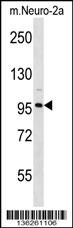 CLCN2 Antibody (N-term) (Cat. APG02626G) western blot analysis in mouse Neuro-2a cell line lysates (35ug/lane).This demonstrates the CLCN2 antibody detected the CLCN2 protein (arrow). |