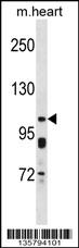 KCNQ5 Antibody (C-term) (Cat. AMM06166G) western blot analysis in mouse heart tissue lysates (35ug/lane).This demonstrates the KCNQ5 antibody detected the KCNQ5 protein (arrow). |