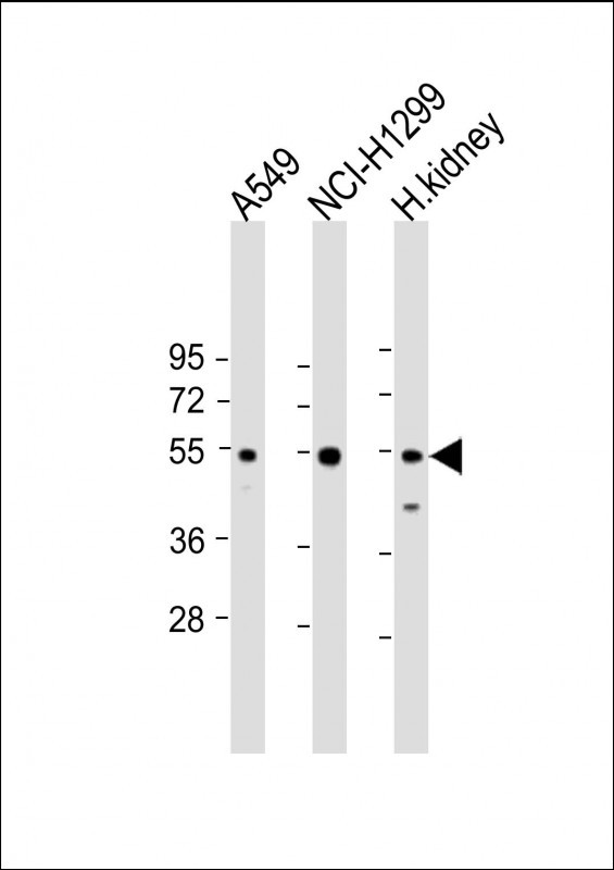 All lanes : Anti-GCNT3 Antibody (N-term) at 1:2000 dilution Lane 1: A549 whole cell lysate Lane 2: NCI-H1299 whole cell lysate Lane 3: human kidney lysate Lysates/proteins at 20 μg per lane. Secondary Goat Anti-Rabbit IgG, (H+L), Peroxidase conjugated at 1/10000 dilution. Predicted band size : 51 kDa Blocking/Dilution buffer: 5% NFDM/TBST. |