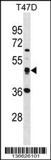 SQRDL Antibody (Center) (Cat. APR10228G) western blot analysis in T47D cell line lysates (35ug/lane).This demonstrates the SQRDL antibody detected the SQRDL protein (arrow). |