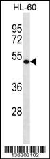 DBNL Antibody (C-term) (Cat. APR15690G) western blot analysis in HL-60 cell line lysates (35ug/lane).This demonstrates the DBNL antibody detected the DBNL protein (arrow). |