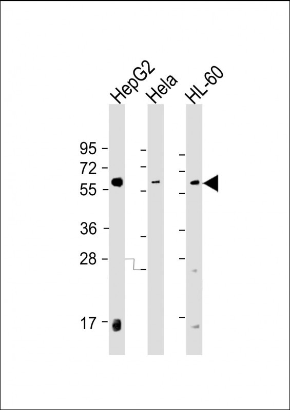 All lanes : Anti-PI4K2A Antibody (C-term) at 1:2000 dilution Lane 1: HepG2 whole cell lysate Lane 2: Hela whole cell lysate Lane 3: HL-60 whole cell lysate Lysates/proteins at 20 μg per lane. Secondary Goat Anti-Rabbit IgG, (H+L), Peroxidase conjugated at 1/10000 dilution. Predicted band size : 54 kDa Blocking/Dilution buffer: 5% NFDM/TBST.