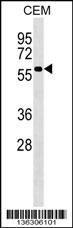 PI4K2A Antibody (C-term) (Cat. AMM07184G) western blot analysis in CEM cell line lysates (35ug/lane).This demonstrates the PI4K2A antibody detected the PI4K2A protein (arrow). |