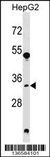 SRM Antibody (Center) (Cat. APR10244G) western blot analysis in HepG2 cell line lysates (35ug/lane).This demonstrates the SRM antibody detected the SRM protein (arrow). |