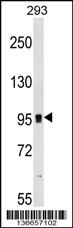 GRM7 Antibody (N-term) (Cat. AMM05993G) western blot analysis in 293 cell line lysates (35ug/lane).This demonstrates the GRM7 antibody detected the GRM7 protein (arrow). |