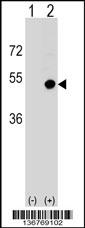 Western blot analysis of CD1D (arrow) using rabbit polyclonal CD1D Antibody (Center) (Cat. APR15336G). 293 cell lysates (2 ug/lane) either nontransfected (Lane 1) or transiently transfected (Lane 2) with the CD1D gene. |