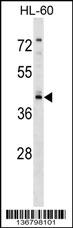 RGS11 Antibody (Center) (Cat. AMM07583G) western blot analysis in HL-60 cell line lysates (35ug/lane).This demonstrates the RGS11 antibody detected the RGS11 protein (arrow). |