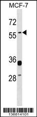 ERVWE1 Antibody (C-term) (Cat. APR11078G) western blot analysis in MCF-7 cell line lysates (35ug/lane).This demonstrates the ERVWE1 antibody detected the ERVWE1 protein (arrow). |