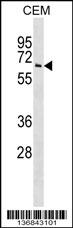 TPP1 Antibody (N-term) (Cat. APR13781G) western blot analysis in CEM cell line lysates (35ug/lane).This demonstrates the TPP1 antibody detected the TPP1 protein (arrow). |