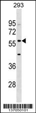 IFIT2 Antibody (Center) (Cat. APR16802G) western blot analysis in 293 cell line lysates (35ug/lane).This demonstrates the IFIT2 antibody detected the IFIT2 protein (arrow). |