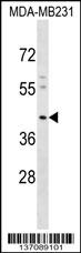 KCNJ15 Antibody (C-term) (Cat. AMM06104G) western blot analysis in MDA-MB231 cell line lysates (35ug/lane).This demonstrates the KCNJ15 antibody detected the KCNJ15 protein (arrow). |