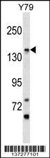 PIGO Antibody (C-term) (Cat. AMM07171G) western blot analysis in Y79 cell line lysates (35ug/lane).This demonstrates the PIGO antibody detected the PIGO protein (arrow). |