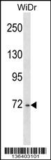 DDX4 Antibody (N-term) (Cat. APR15713G) western blot analysis in WiDr cell line lysates (35ug/lane).This demonstrates the DDX4 antibody detected the DDX4 protein (arrow).