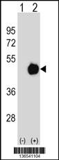 Western blot analysis of PPME1 (arrow) using rabbit polyclonal PPME1 Antibody (C-term) (Cat. AMM07292G). 293 cell lysates (2 ug/lane) either nontransfected (Lane 1) or transiently transfected (Lane 2) with the PPME1 gene. |