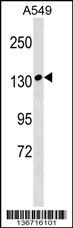 MYBPC1 Antibody (Center) (Cat. AMM06517G) western blot analysis in A549 cell line lysates (35ug/lane).This demonstrates the MYBPC1 antibody detected the MYBPC1 protein (arrow). |