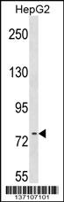 RRN3 Antibody (Center) (Cat. AMM07669G) western blot analysis in HepG2 cell line lysates (35ug/lane).This demonstrates the RRN3 antibody detected the RRN3 protein (arrow). |