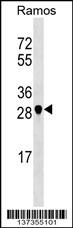 NOSIP Antibody (N-term) (Cat. APR17599G) western blot analysis in Ramos cell line lysates (35ug/lane).This demonstrates the NOSIP antibody detected the NOSIP protein (arrow). |