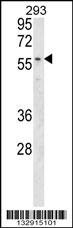 MBOAT2 Antibody (Center) (Cat. APR17348G) western blot analysis in 293 cell line lysates (35ug/lane).This demonstrates the MBOAT2 antibody detected the MBOAT2 protein (arrow). |