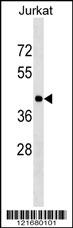 HLA-C Antibody (Center) (Cat. AMM05384G) western blot analysis in Jurkat cell line lysates (35ug/lane).This demonstrates the HLA-C antibody detected the HLA-C protein (arrow). |