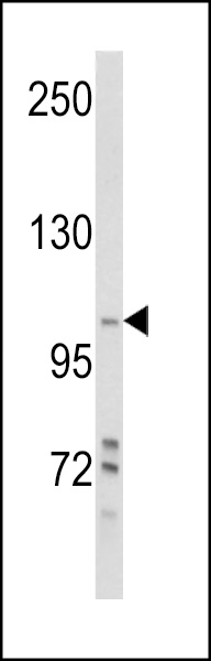 Western blot analysis of Phospho-PI3KC3-pS425 (Cat. APR09274G) in MDA-MB231 cell line lysates (35ug/lane). PI3KC3 (arrow) was detected using the purified Pab.