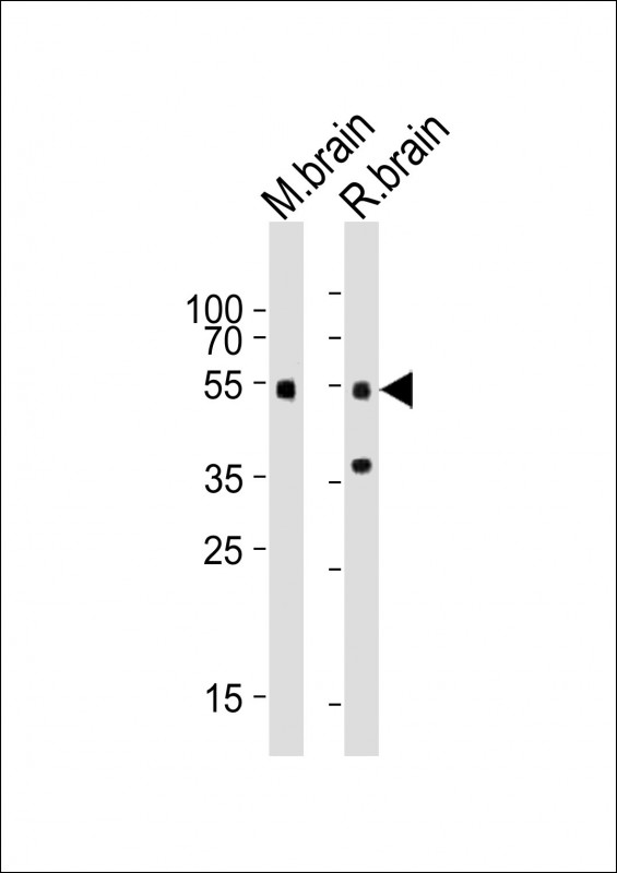 All lanes : Anti-Smad3 Antibody (Center) at 1:1000 dilution Lane 1: M. brain tissue lysates Lane 2: R. brain tissue lysates Lysates/proteins at 20 μg per lane. Secondary Goat Anti-Rabbit IgG, (H+L), Peroxidase conjugated at 1/10000 dilution Predicted band size : 48 kDa Blocking/Dilution buffer: 5% NFDM/TBST. |