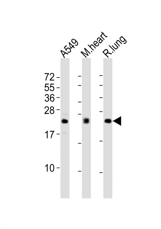 All lanes : Anti-FGF2 Antibody at 1:2000 dilution Lane 1: A549 whole cell lysates Lane 2: mouse heart lysates Lane 3: rat lung lysates Lysates/proteins at 20 μg per lane. Secondary Goat Anti-Rabbit IgG, (H+L), Peroxidase conjugated at 1/10000 dilution Predicted band size : 31 kDa Blocking/Dilution buffer: 5% NFDM/TBST.