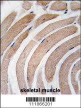 Formalin-fixed and paraffin-embedded human skeletal muscle tissue reacted with APG4D Antibody (S341) (Cat. APG02054G), which was peroxidase-conjugated to the secondary antibody, followed by DAB staining. This data demonstrates the use of this antibody for immunohistochemistry; clinical relevance has not been evaluated. |