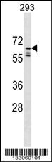 PPIL2 Antibody (C-term) (Cat. AMM07285G) western blot analysis in 293 cell line lysates (35ug/lane).This demonstrates the PPIL2 antibody detected the PPIL2 protein (arrow). |