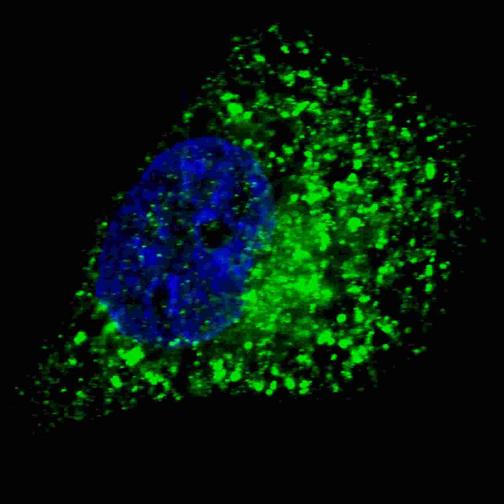 Fluorescent image of U251 cells stained with GABARAP (N-term) antibody. U251 cells were treated with Chloroquine (50 μM,16h), then fixed with 4% PFA (20 min), permeabilized with Triton X-100 (0.2%, 30 min). Cells were then incubated with APG03029G GABARAP (N-term) primary antibody (1:500, 2 h at room temperature). For secondary antibody, Alexa Fluor? 488 conjugated donkey anti-rabbit antibody (green) was used (1:1000, 1h). Nuclei were counterstained with Hoechst 33342 (blue) (10 μg/ml, 5 min). GABARAP immunoreactivity is localized to autophagic vacuoles in the cytoplasm of U251 cells.