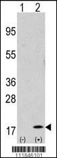 Western blot analysis of GABARAP (arrow) using purified Pab (Cat. APG03029G). 293 cell lysates (2 ug/lane) either nontransfected (Lane 1) or transiently transfected with the GABARAP gene (Lane 2) (Origene Technologies). |