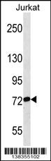 RPAP3 Antibody (Center) (Cat. AMM07647G) western blot analysis in Jurkat cell line lysates (35ug/lane).This demonstrates the RPAP3 antibody detected the RPAP3 protein (arrow). |
