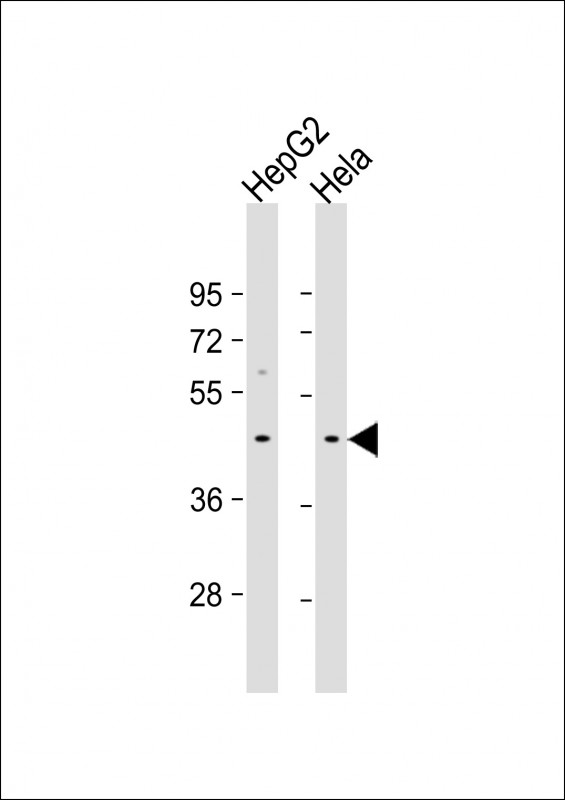 All lanes : Anti-GIPC3 Antibody (C-term) at 1:1000 dilution Lane 1: HepG2 whole cell lysate Lane 2: Hela whole cell lysate Lysates/proteins at 20 μg per lane. Secondary Goat Anti-Rabbit IgG, (H+L), Peroxidase conjugated at 1/10000 dilution. Predicted band size : 34 kDa Blocking/Dilution buffer: 5% NFDM/TBST. |