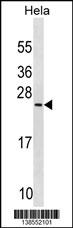 PRELID1 Antibody (N-term) (Cat. AMR09506G) western blot analysis in Hela cell line lysates (35ug/lane).This demonstrates the PRELID1 Antibody detected the PRELID1 protein (arrow). |