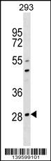 OSCAR Antibody (C-term)(Cat. APR17689G) western blot analysis in 293 cell line lysates (35ug/lane).This demonstrates the OSCAR antibody detected the OSCAR protein (arrow). |