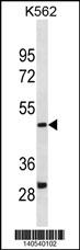 DHODH Antibody (Center)(Cat. APR07561G) western blot analysis in K562 cell line lysates (35ug/lane).This demonstrates the DHODH antibody detected the DHODH protein (arrow). |