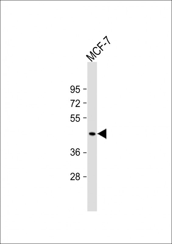 Anti-MBOAT7 Antibody (Center) at 1:2000 dilution + MCF-7 whole cell lysate Lysates/proteins at 20 μg per lane. Secondary Goat Anti-Rabbit IgG, (H+L), Peroxidase conjugated at 1/10000 dilution. Predicted band size : 53 kDa Blocking/Dilution buffer: 5% NFDM/TBST.