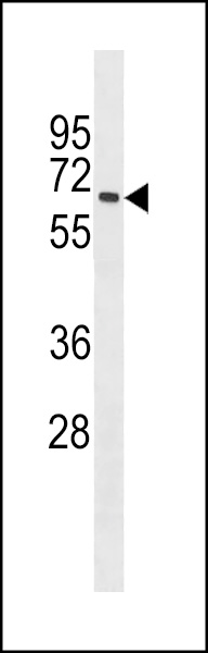 MBOAT7 Antibody (Center) (Cat. APR17331G) western blot analysis in A549 cell line lysates (35ug/lane).This demonstrates the MBOAT7 antibody detected the MBOAT7 protein (arrow). |